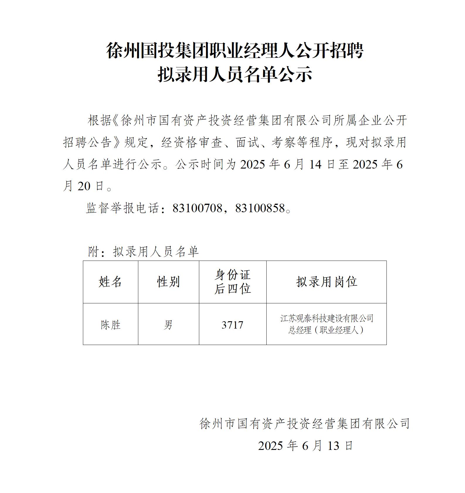徐州國投集團(tuán)職業(yè)經(jīng)理人公開招聘擬錄用人員名單公示