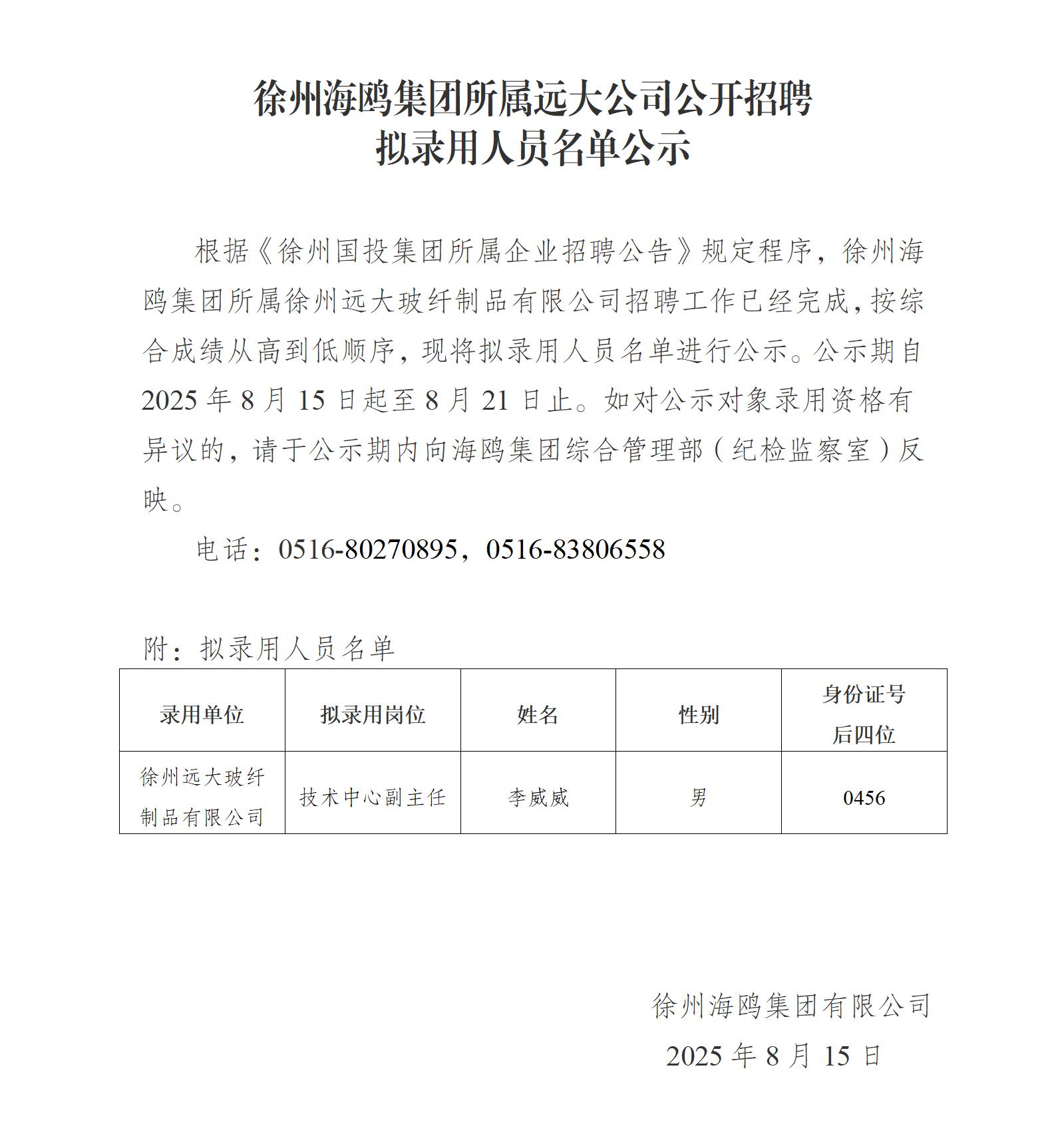 徐州海鷗集團所屬遠大公司公開招聘擬錄用人員名單公示