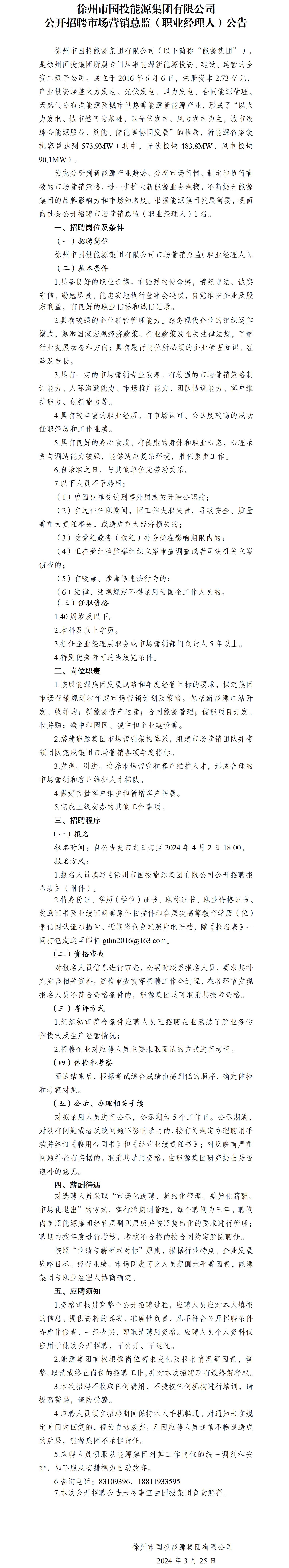 徐州市國投能源集團有限公司公開招聘市場營銷總監(jiān)(職業(yè)經(jīng)理人)公告
