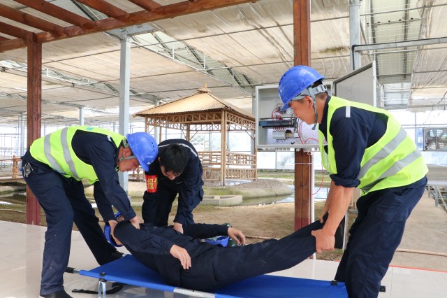 14時35分,刺耳的警報劃破寧靜,觸電搶救應(yīng)急演練率先登場。四名電站運(yùn)維員工組成的應(yīng)急小組迅疾響應(yīng),嚴(yán)格按照預(yù)案流程行動。只見一人果斷切斷電源,另一人利用絕緣桿將“觸電者”安全脫離危險區(qū),其余隊(duì)員立即上前進(jìn)行規(guī)范的心肺復(fù)蘇急救。整個過程緊張有序,展現(xiàn)了團(tuán)隊(duì)在突發(fā)險情中的高效協(xié)作與過硬技能。演練結(jié)束,安全專家即時點(diǎn)評,對脫離電源的技術(shù)要點(diǎn)與心肺復(fù)蘇操作標(biāo)準(zhǔn)進(jìn)行強(qiáng)化講解,切實(shí)提升現(xiàn)場人員的應(yīng)急實(shí)戰(zhàn)能力。