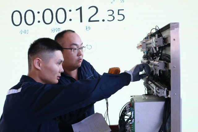 練兵場亦是競技臺。15時30分,高壓開關(guān)柜回路故障消缺實(shí)操比賽開始。多支參賽隊(duì)伍輪番上陣,在裁判嚴(yán)格監(jiān)督下展開較量。面對預(yù)設(shè)的復(fù)雜回路故障,選手們身著統(tǒng)一工裝,佩戴齊整防護(hù),審閱圖紙、測試分析、精準(zhǔn)排障。每一次舉手示意操作、每一次工具精準(zhǔn)落點(diǎn),都體現(xiàn)著“安全第一、規(guī)范先行”的鐵律。賽場氣氛緊張激烈,選手們沉著冷靜的故障診斷能力與嫻熟的動手能力贏得陣陣贊嘆。