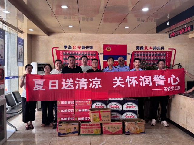 為表達對高溫酷暑中堅守崗位的公安民警的敬意與關懷,深化警企共建情誼,近日,蘇悅黨支部組織黨員代表,前往徐州市公安局泉山分局王陵派出所,開展“夏日送清涼”慰問活動,為奮戰(zhàn)在維護治安、服務群眾第一線的民警送去夏日清涼物資。