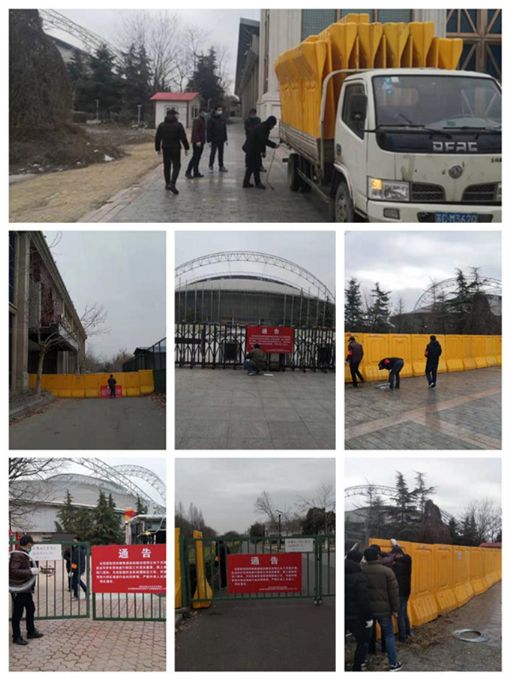 3.開展外圍防疫。因特殊地理位置,華強資產(chǎn)公司委托成功物業(yè)公司承擔(dān)本部外圍防疫工作,經(jīng)過現(xiàn)場勘察制定了園區(qū)水馬封堵及復(fù)工園區(qū)防疫方案。在目前防疫工作嚴(yán)峻、水馬租賃困難及運輸不便的情況下,通過各種途徑聯(lián)系到租賃方,于2月11日上午組織成功大廈工程人員、藝術(shù)館項目人員以及華強安防人員利用半天時間進(jìn)行突擊封堵,除主要出入口封堵外,還對在仔細(xì)排查園區(qū)發(fā)現(xiàn)的十余處人為損毀缺口進(jìn)行封堵處理,同時清退閑雜人員并張貼封園通告。